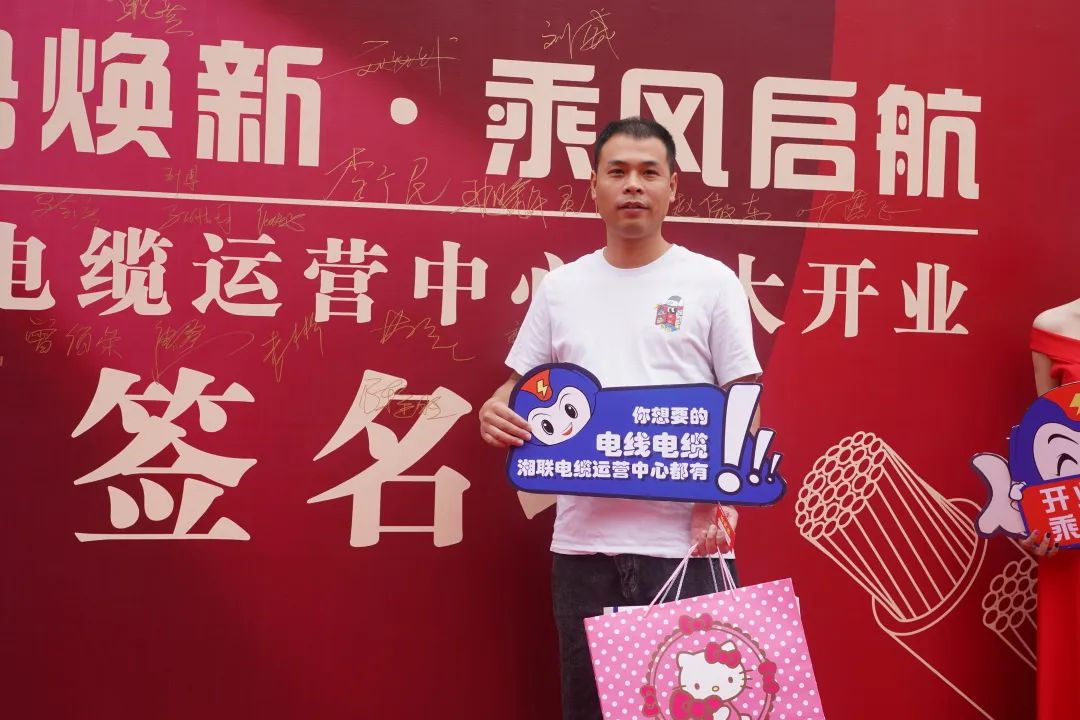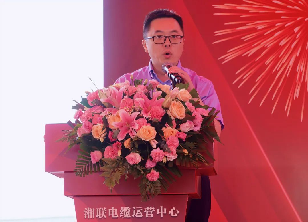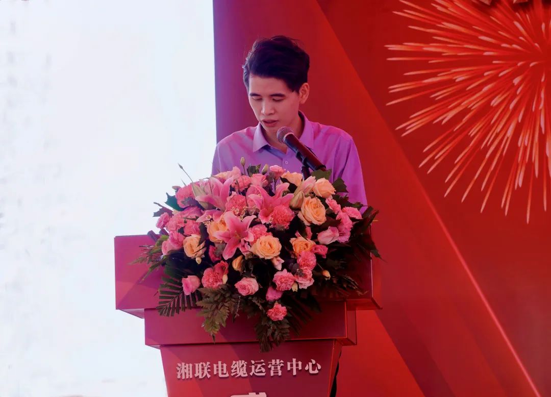 郴州市佳琪物资有限公司总经理许灵健许总作为经销商代表在开业典礼上致贺词,在发言中,他表达了对湘联电缆的高度认可,并表示希望能够和湘联电缆一起,同心同行,一起筑造更美好的明天。