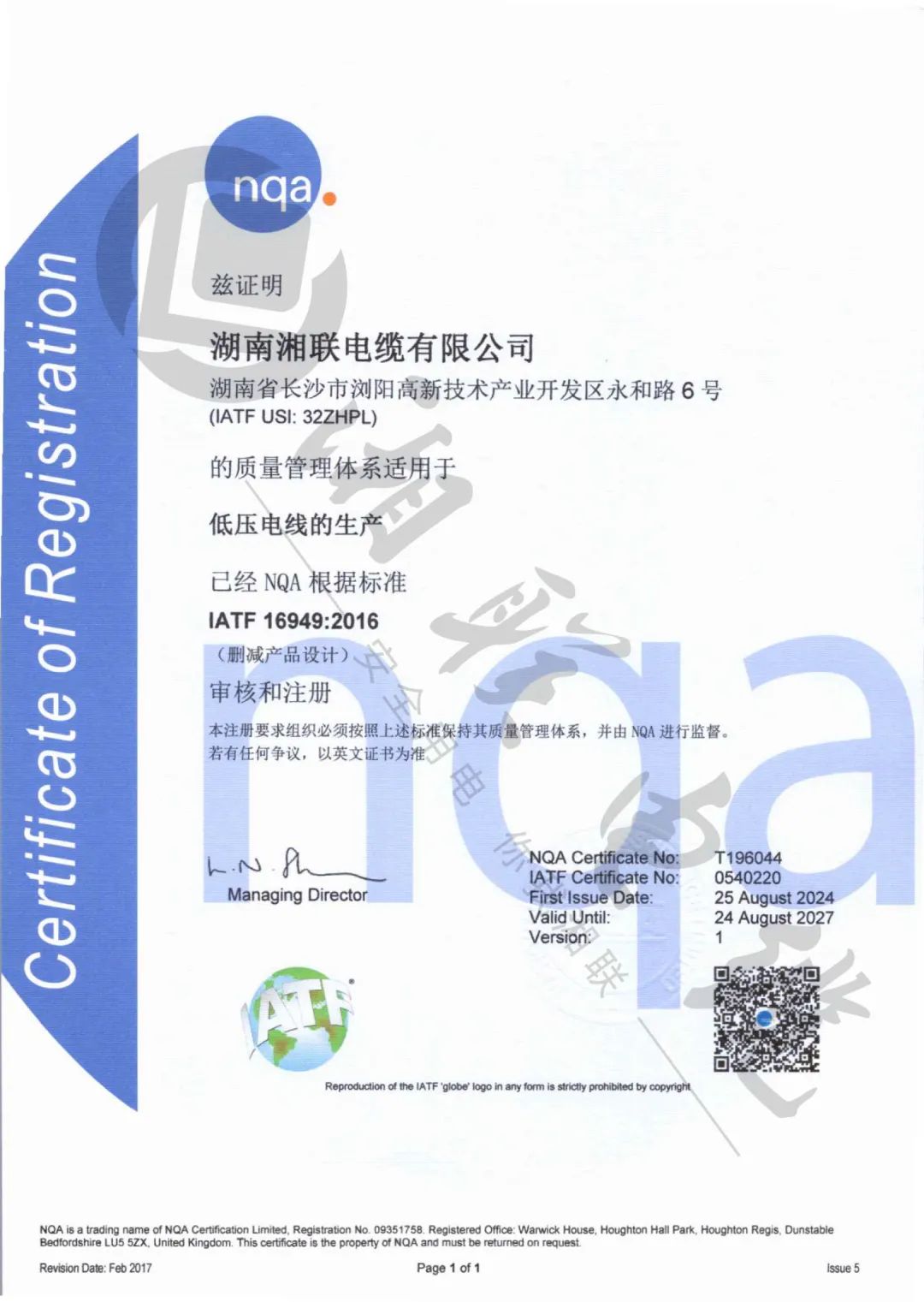 近日,湘联电缆成功获得了IATF16949:2016质量管理体系认证。IATF 16949:2016标准是专为汽车行业设计的质量管理体系标准,此项认证标志着湘联电缆在质量管理体系、产品品质等方面均已满足汽车行业的高质量管理标准。