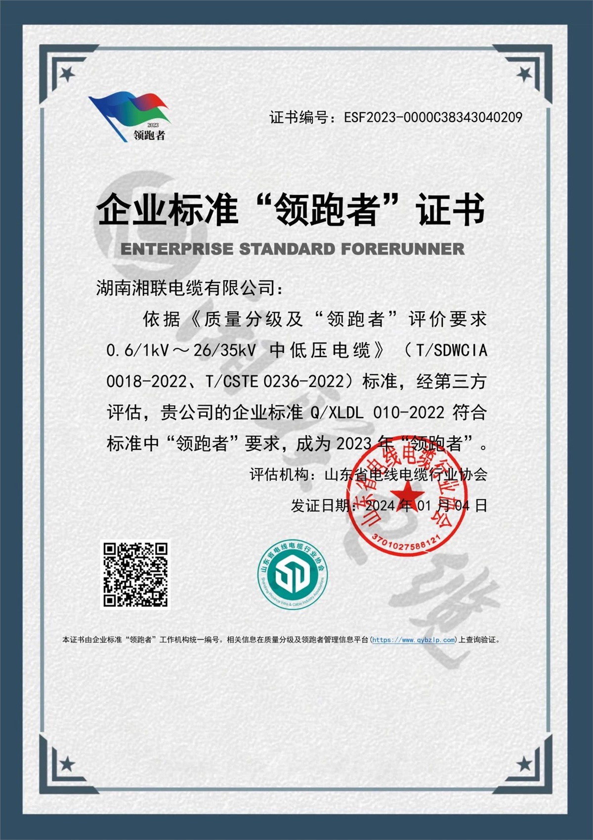 1月,企业标准领跑者管理信息平台公布了2023年企业标准领跑者名单,湖南湘联电缆有限公司凭借企业标准Q/XLDL 010-2022,成为2023年企业标准“领跑者”,湘联电缆连续三年获此殊荣。