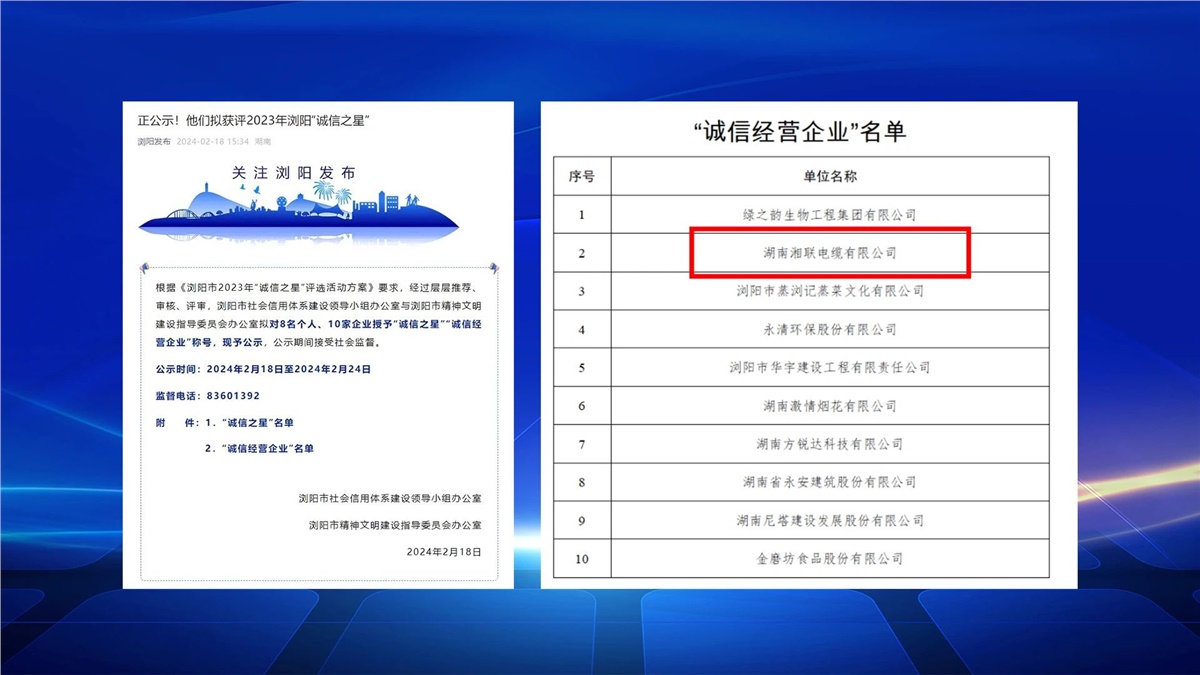 2月,浏阳市社会信用体系建设与浏阳市精神文明建设指导委员会办公室联合开展的浏阳市2023年“诚信之星”评选进行公示,湖南湘联电缆有限公司成功入选,成为2023年“诚信之星”。