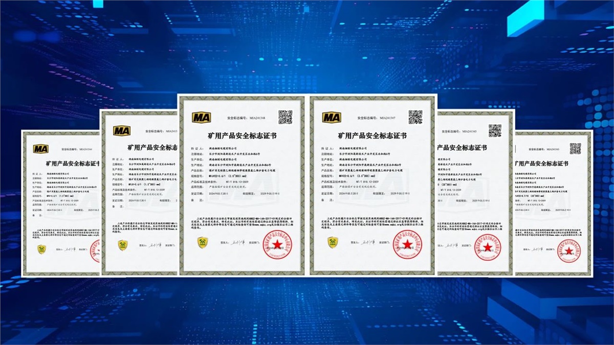5月,湖南湘联电缆有限公司成功取得安标国家矿用产品安全标志中心颁发MVV-0.6/1(1.5~300)mm²煤矿用聚氯乙烯绝缘聚氯乙烯护套电力电缆、MYJV-8.7/10(25~300)mm²煤矿用交联聚乙烯绝缘聚氯乙烯护套电力电缆等六个产品的矿用产品安全标志证书。