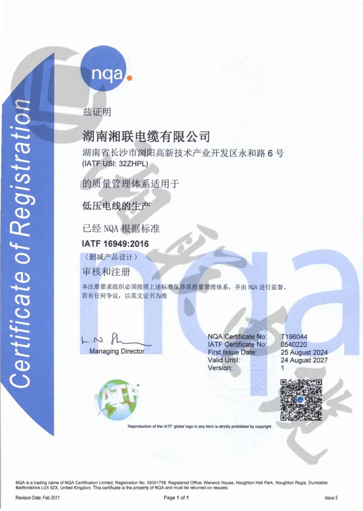 9月,湘联电缆成功获得了IATF16949:2016质量管理体系认证。IATF 16949:2016标准是专为汽车行业设计的质量管理体系标准,此项认证标志着湘联电缆在质量管理体系、产品品质等方面均已满足汽车行业的高质量管理标准。