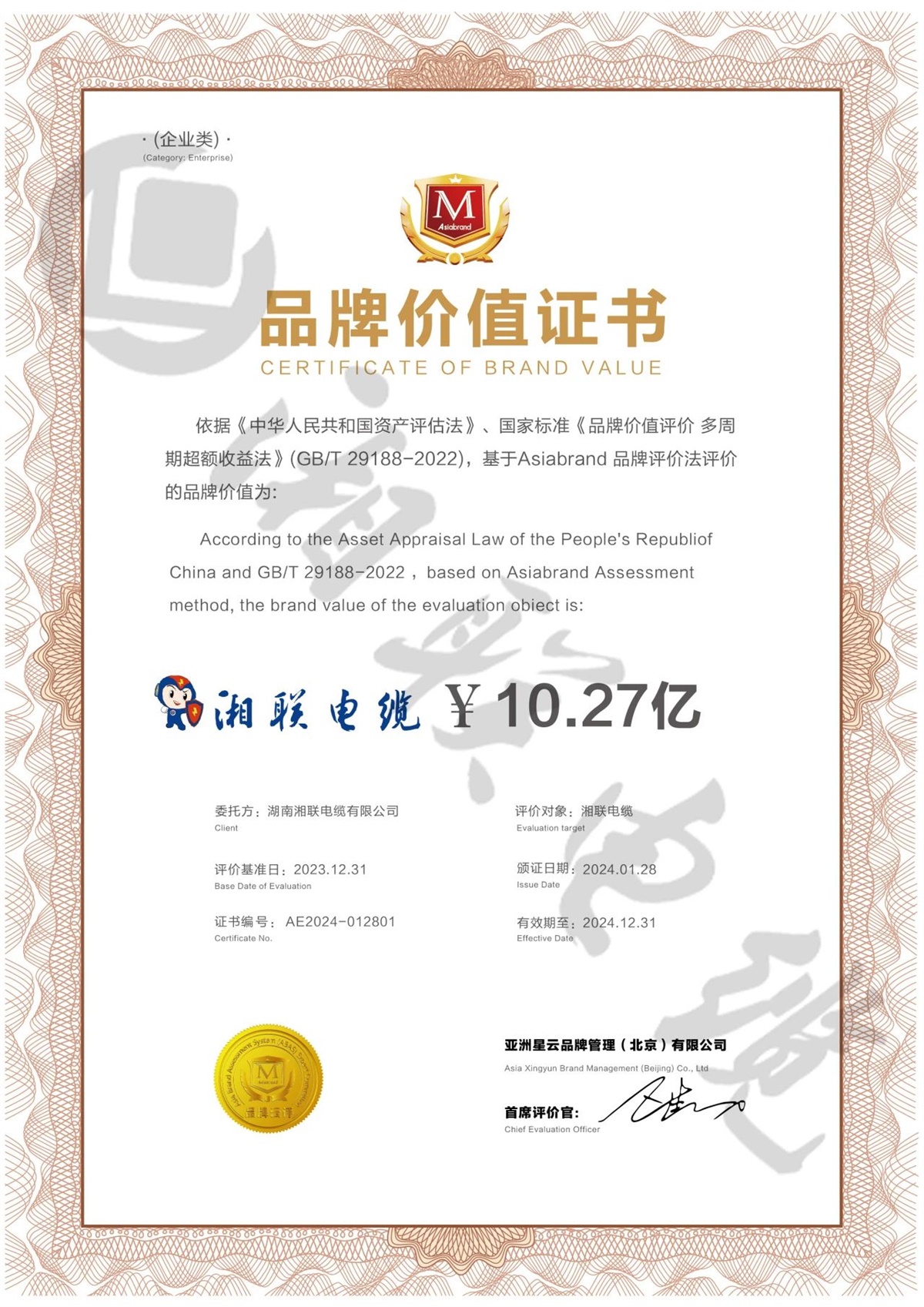1月,经权威品牌评价机构 Asiabrand 依据《中华人民共和国资产评估法》、国家标准《品牌价值评价 多周期超额收益法》(GB/T29188-2022)对湘联电缆进行全面评估,湘联电缆品牌价值达10.27亿。