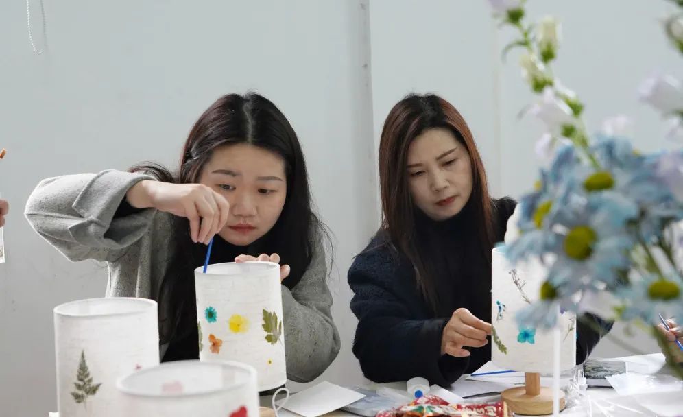 现场欢声笑语不断,大家交流着手作技巧,分享着生活趣事,氛围其乐融融。当灯光亮起,柔和的光线透过带有花朵的灯罩,散发出温馨的气息。