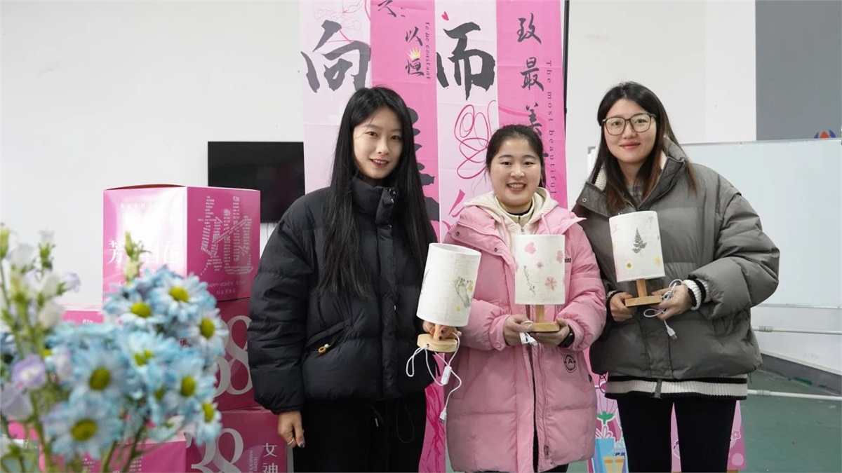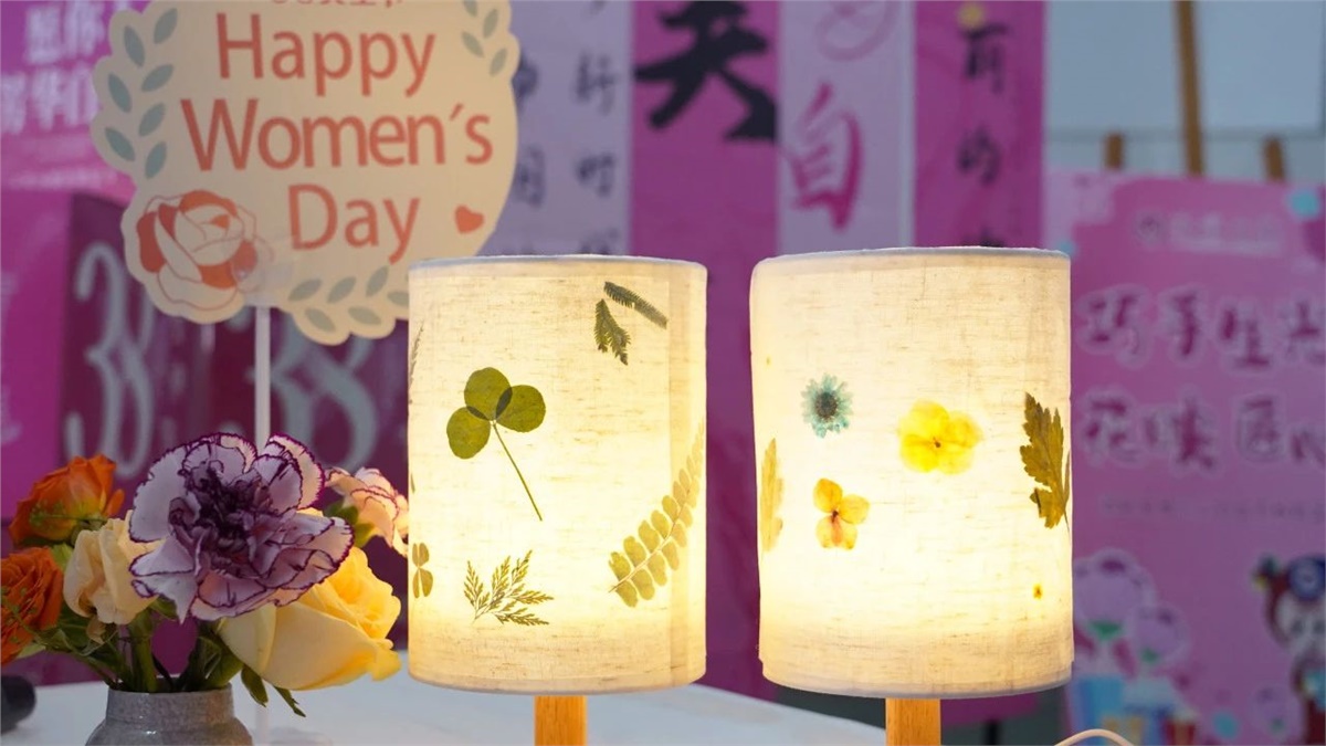 为了让公司的女性员工在忙碌的工作之余,尽情享受节日的欢乐,公司特别准备了手工压花台灯制作活动。活动现场,女员工们围坐在一起,挑选着心仪的干花,小心翼翼地将花瓣一片片摘下,再精心排列组合,粘贴在台灯灯罩上。