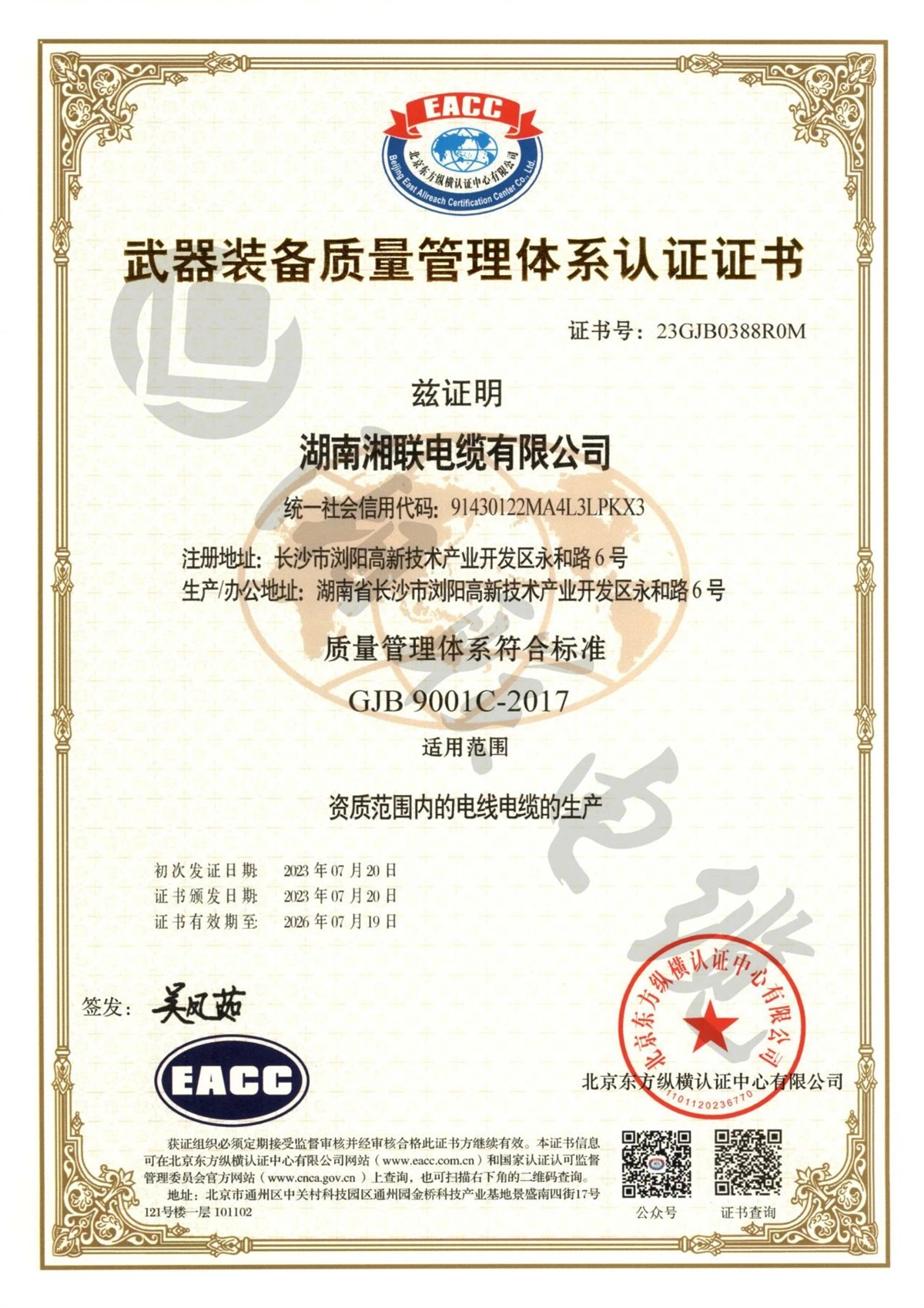 国防和军队建设是国家安全的坚强后盾。电线电缆是国防建设不可或缺的基础设施,它支撑着通信、指挥、探测与侦察系统的稳定运行,是军队战斗力的重要保障。作为电线电缆行业知名品牌,近年来,湘联电缆以习近平强军思想和习近平总书记关于武器装备质量建设的重要论述精神为指导,有序开展军用电线电缆研发生产工作。